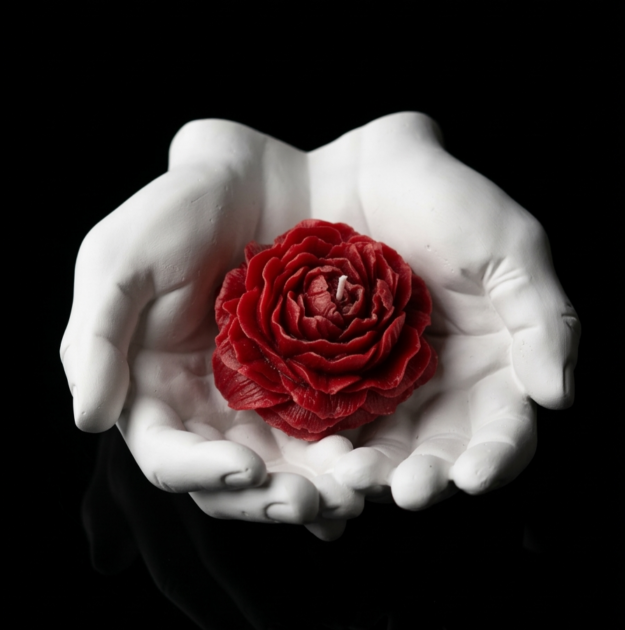 Dłonie wykonane z gipsu polimerowego. Do zestawu dołączona świeca z wosku pszczelego. Świeca aromatyzowana i barwiona. Odlew gipsowy wielkości naturalnych dłoni.