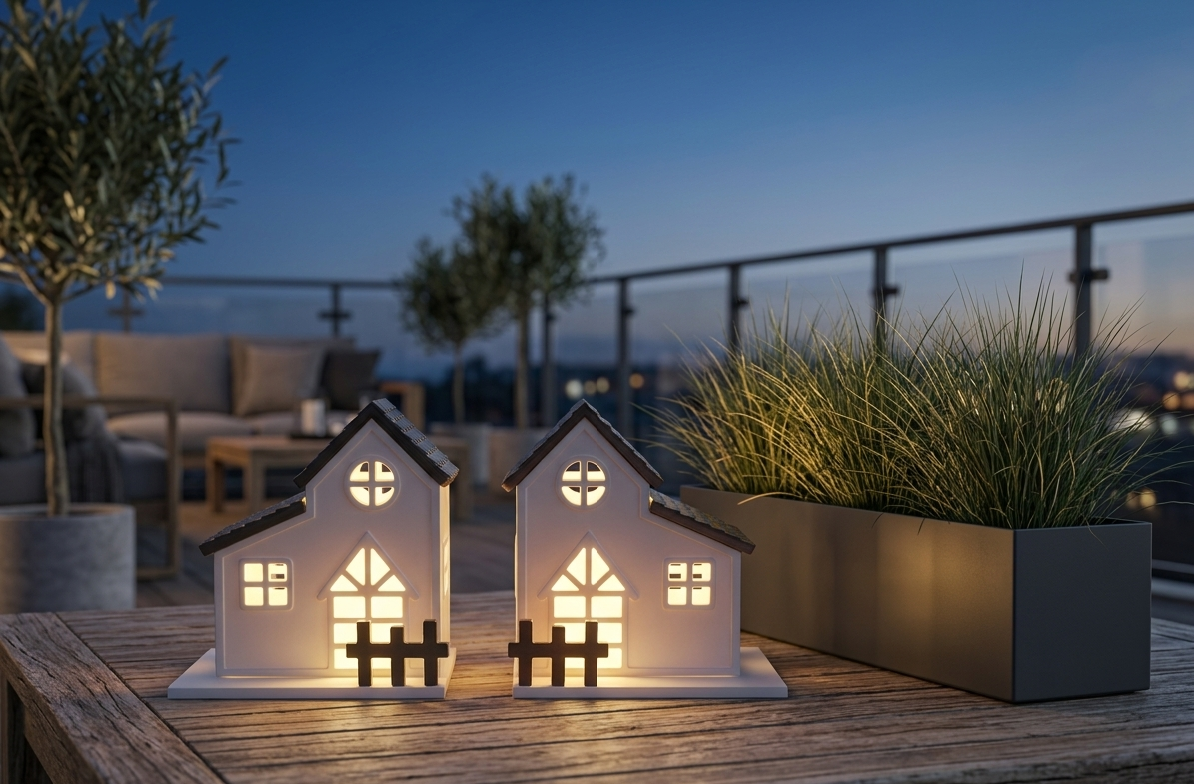 Domek na podstawce nie jest przymocowany. Dzięki temu można w nim umieścić dowolne oświetlenie.