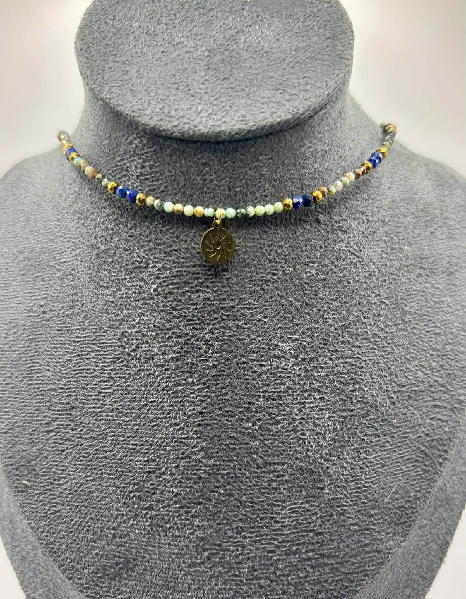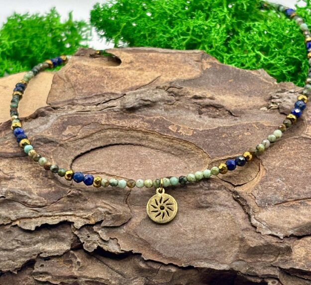 Ręcznie wykonany naszyjnik z naturalnego turkusu afrykańskiego oraz hematytu to połączenie energii ziemi i słońca. Jego naturalne odcienie zieleni, błękitu i złota przywodzą na myśl harmonię natury i spokój płynący z kontaktu z przyrodą.