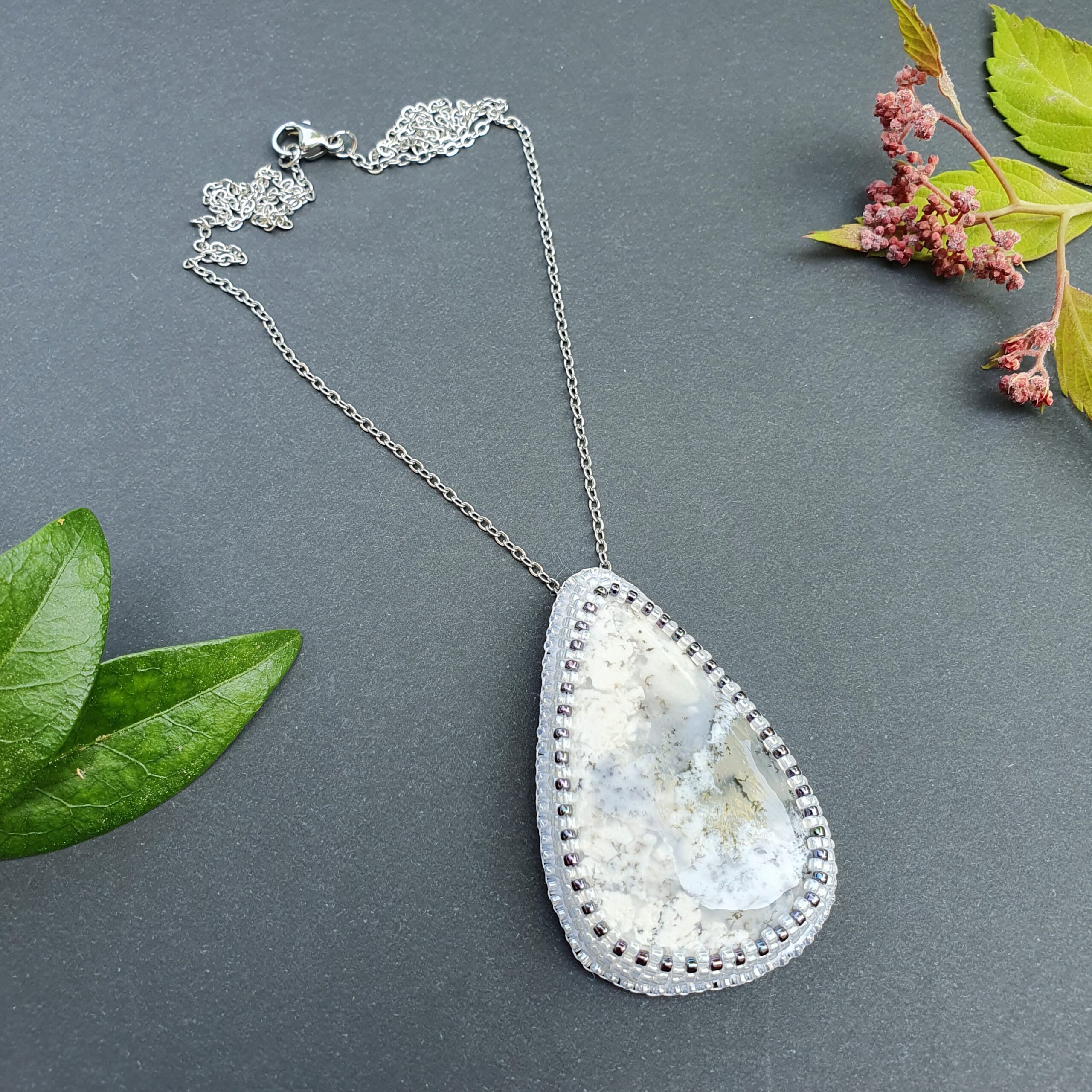 Wyjątkowy, ręcznie robiony wisiorek z Opalem Dendrytowym, opleciony koralikami w mleczno białych kolorach. Ten niezwykły naszyjnik to nie tylko piękna ozdoba, ale również talizman, który przypomina nam o naszej łączności z naturą i tajemnicami wszechświata. Jest idealnym prezentem dla bliskiej osoby lub wyjątkowym sposobem na wyrażenie swojej indywidualności.