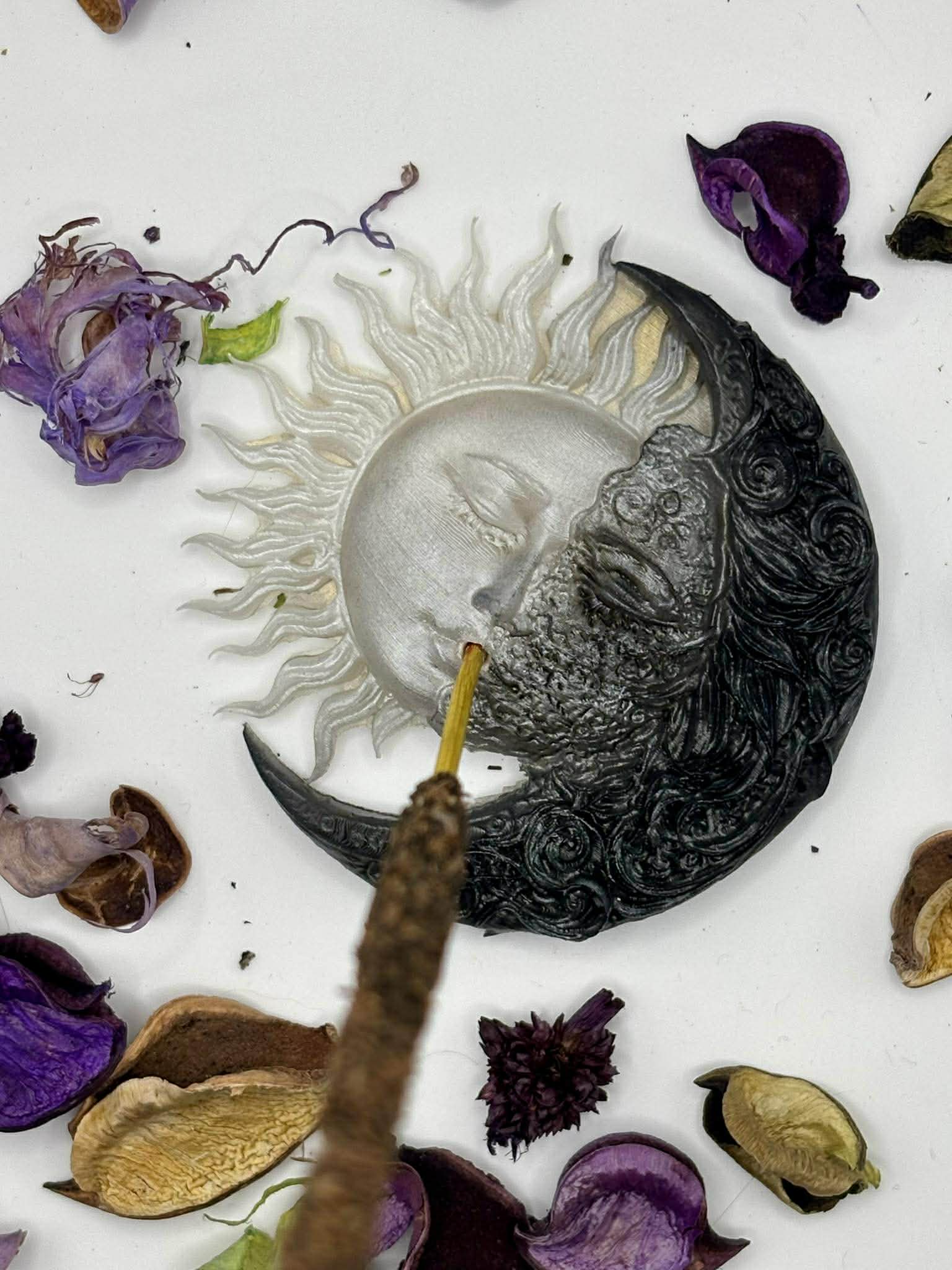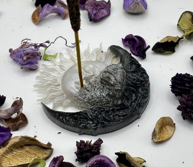 Ta ręcznie wykonana podstawka pod kadzidło powstała z żywicy epoksydowej i symbolizuje harmonię między dniem a nocą, słońcem a księżycem, energią działania i spokojem intuicji.