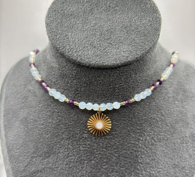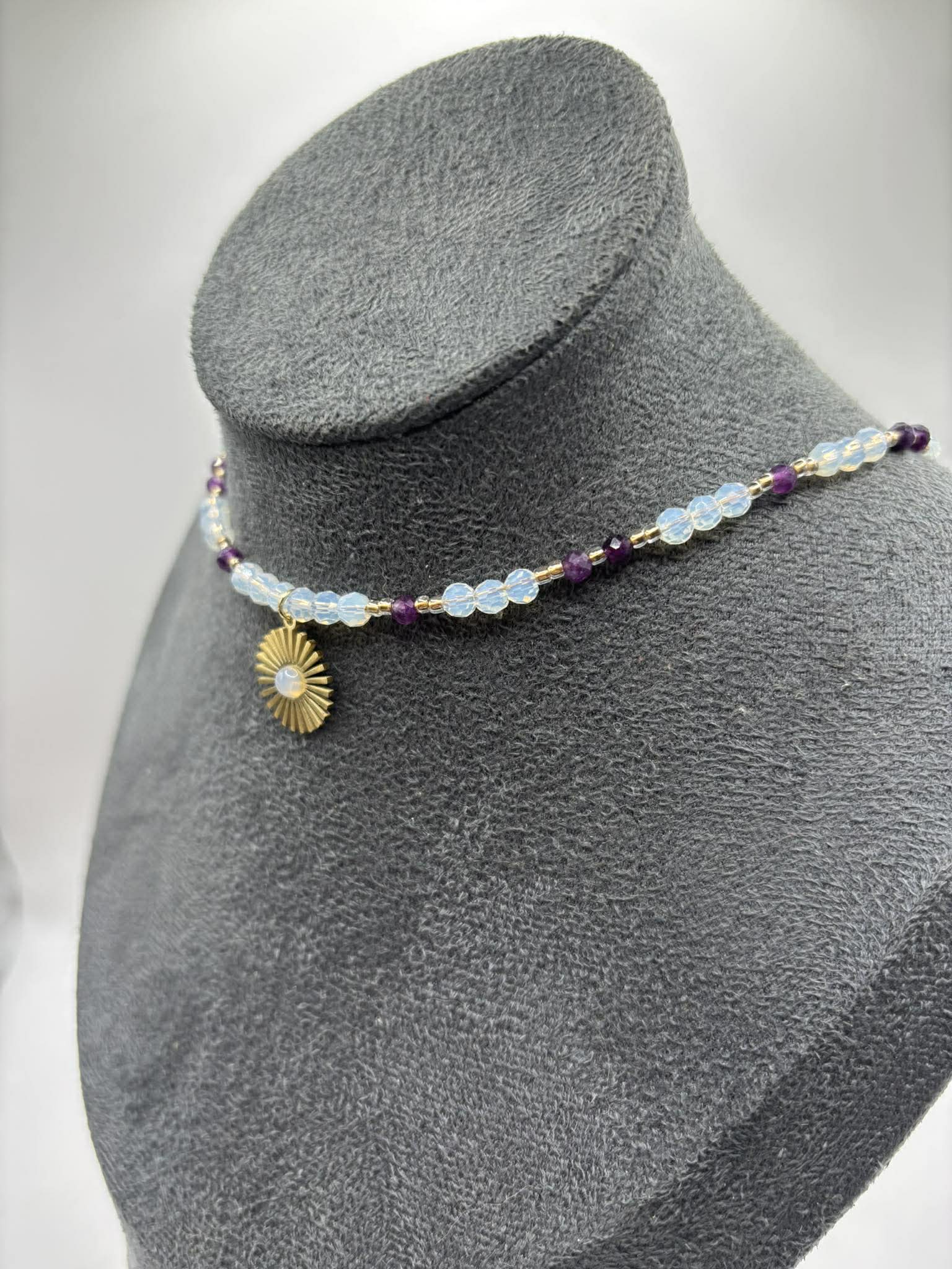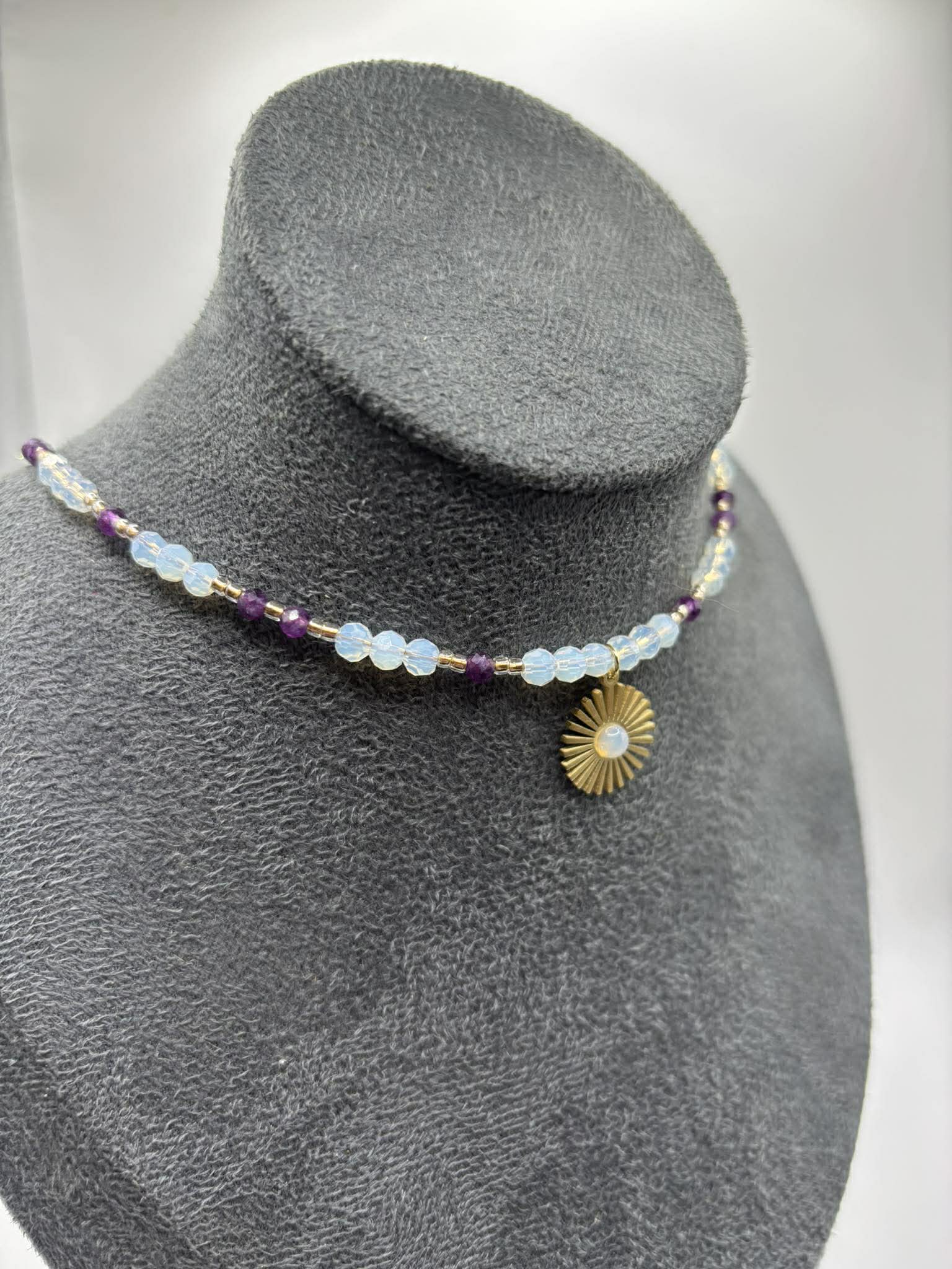 Ten naszyjnik powstał z połączenia dwóch subtelnych, a zarazem silnych energii — ametystu i opalitu.